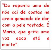 De repente uma de nós cai de costas na areia gemendo de dor com a pele tostada. É Maria, que grita uma voz seca até a morte. É iminente uma decisão. Então retiramos apenas uma parte da carga. Cada uma pega o que pode e corre com todas as forças rumo ao abrigo. Em segundos conseguimos chegar à sombra do buraco, quase sem forças e ardendo com muitas queimaduras pelo corpo. Por muito pouco tempo queimaríamos todas como folhas secas ao fogo. De lá, com lágrimas nos olhos avistamos o corpo de Maria que jazia sob o calor implacável do grande Saara. Fica com Deus amiga !?
